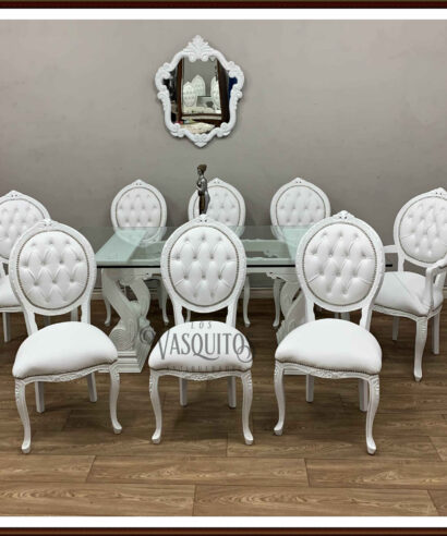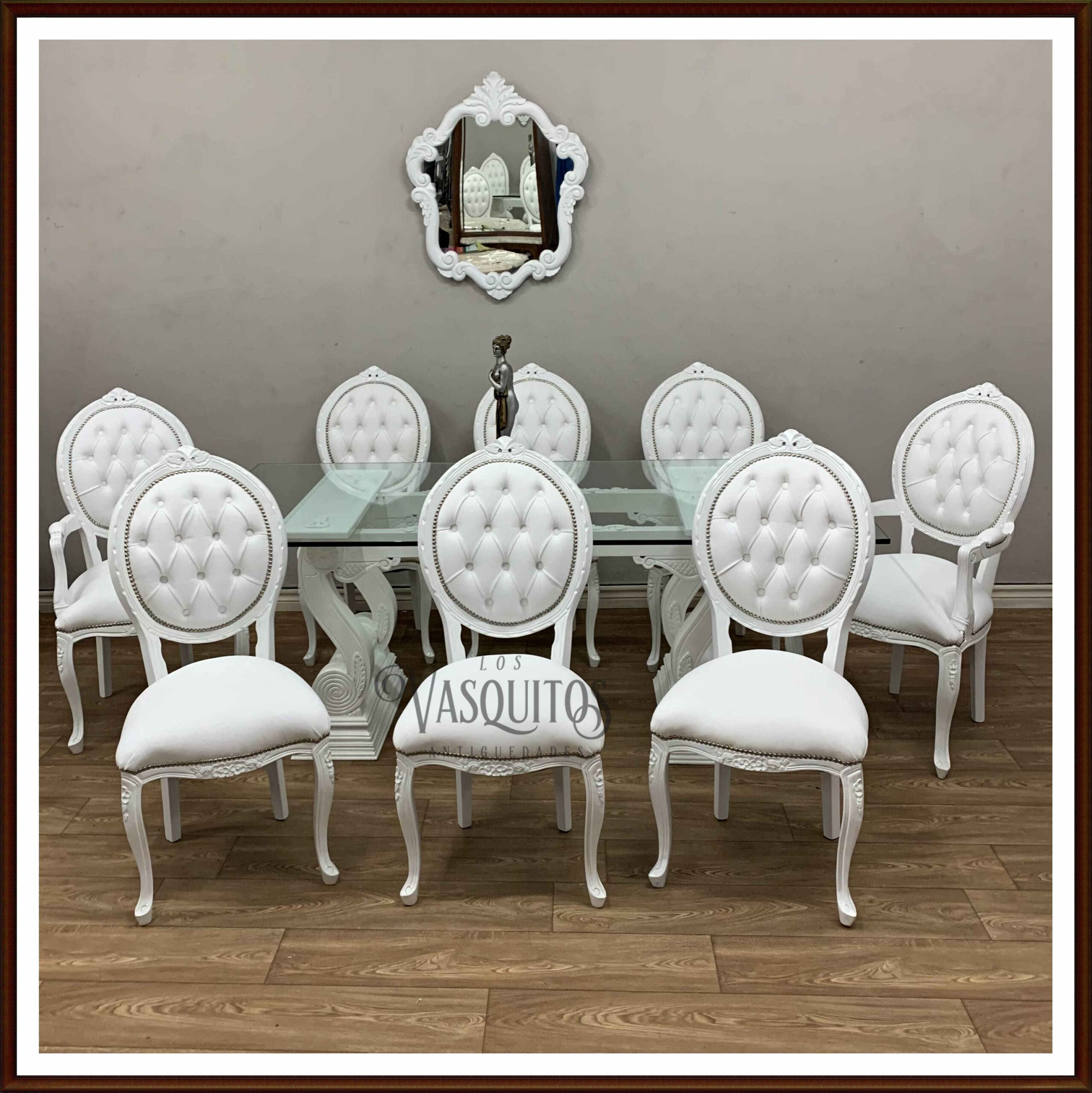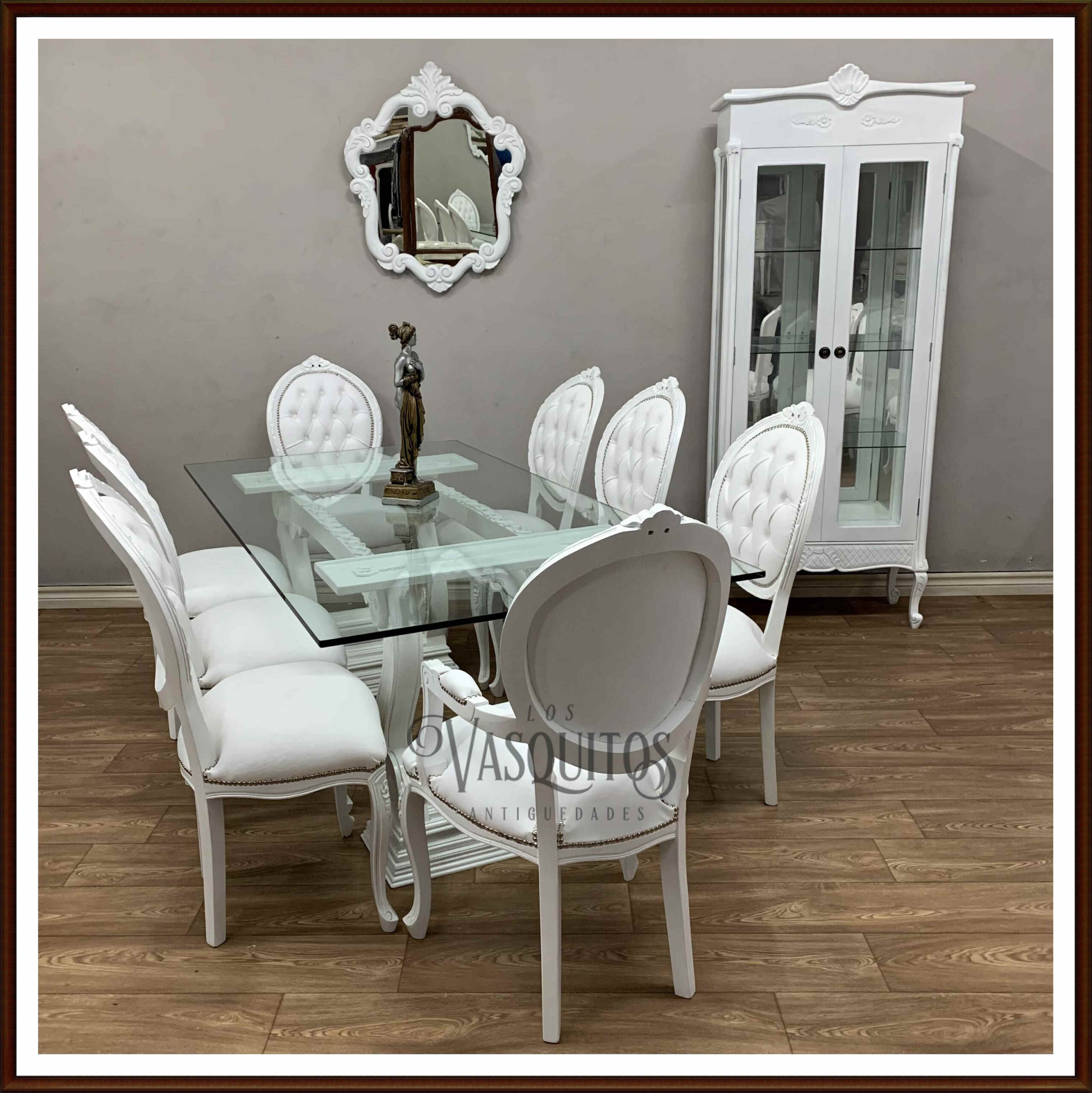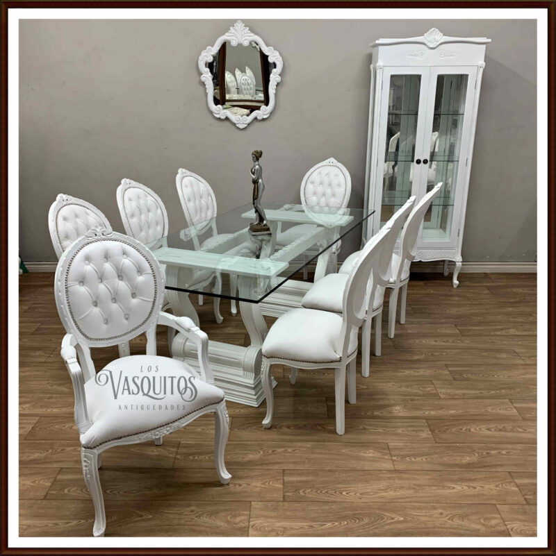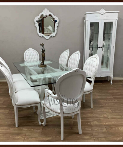 PRODUCTO: Juego de 6 Sillas Variada + 2 Cabeceros Variados + Mesa Imperio Con Tapa de Vidrio en 2.00×1.00 En 15mm + Espejo Tallado en 1.27×0.80 + Cristalero Provenzal en 2.00 x 1.00